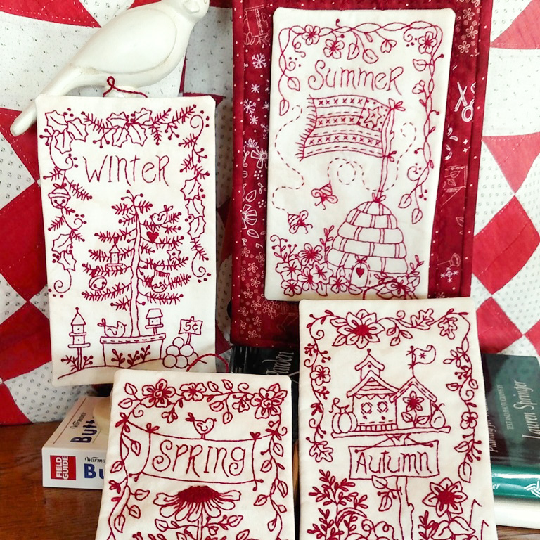 Feature each Season in its turn on a RedWork Patchwork hanging displayed on a clever mini Quilt Stand. Each Season easily "Buttons On" the background to show off every 3 months.