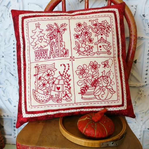 Begin a New Season with a sweet pillow to celebrate ALL the Seasons we will enjoy during the year. With the change of each Season you can bring out your cute petite pillow to honor that time of year! Each little stitched block shows off the Best of that Season on your RedWork Embroidery. Finish as a small pillow that you will surely find a nice spot to show off during the year.