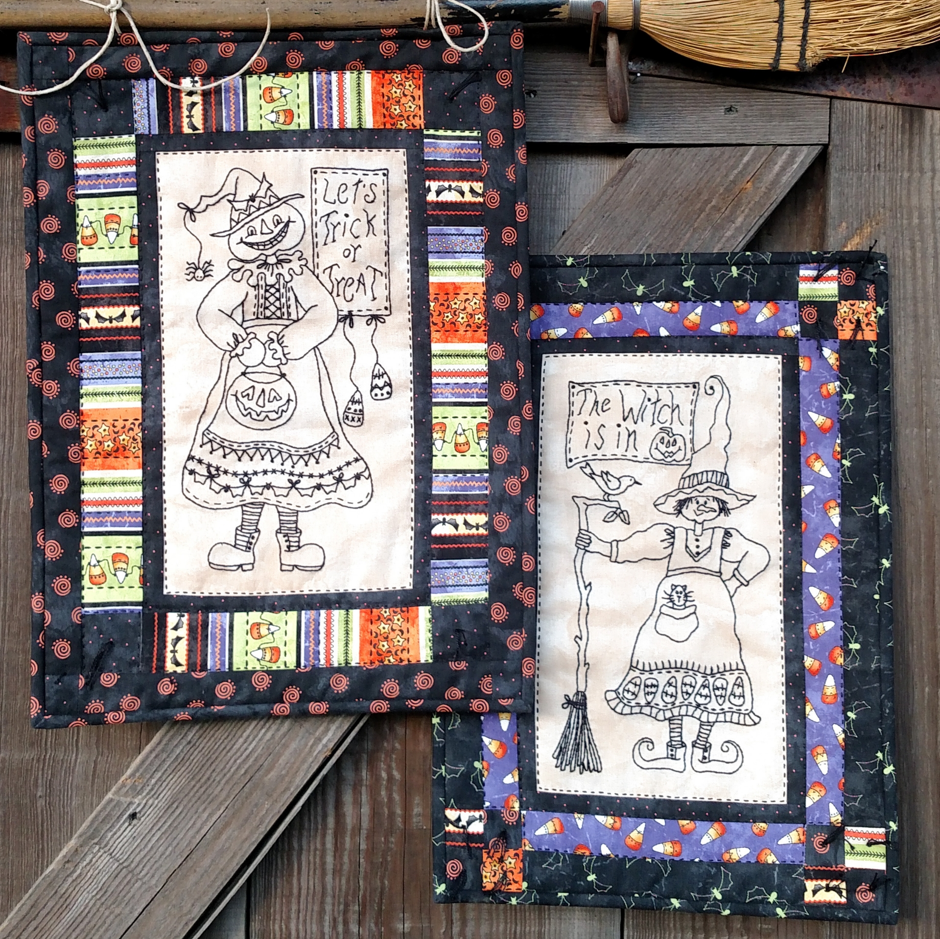 A Pair of Wicked Witch Wall Hangings or Table Toppers to enliven your Halloweenie Celebrations. Fun BlackWork Witches sparked with colorful Halloweenie Cottons