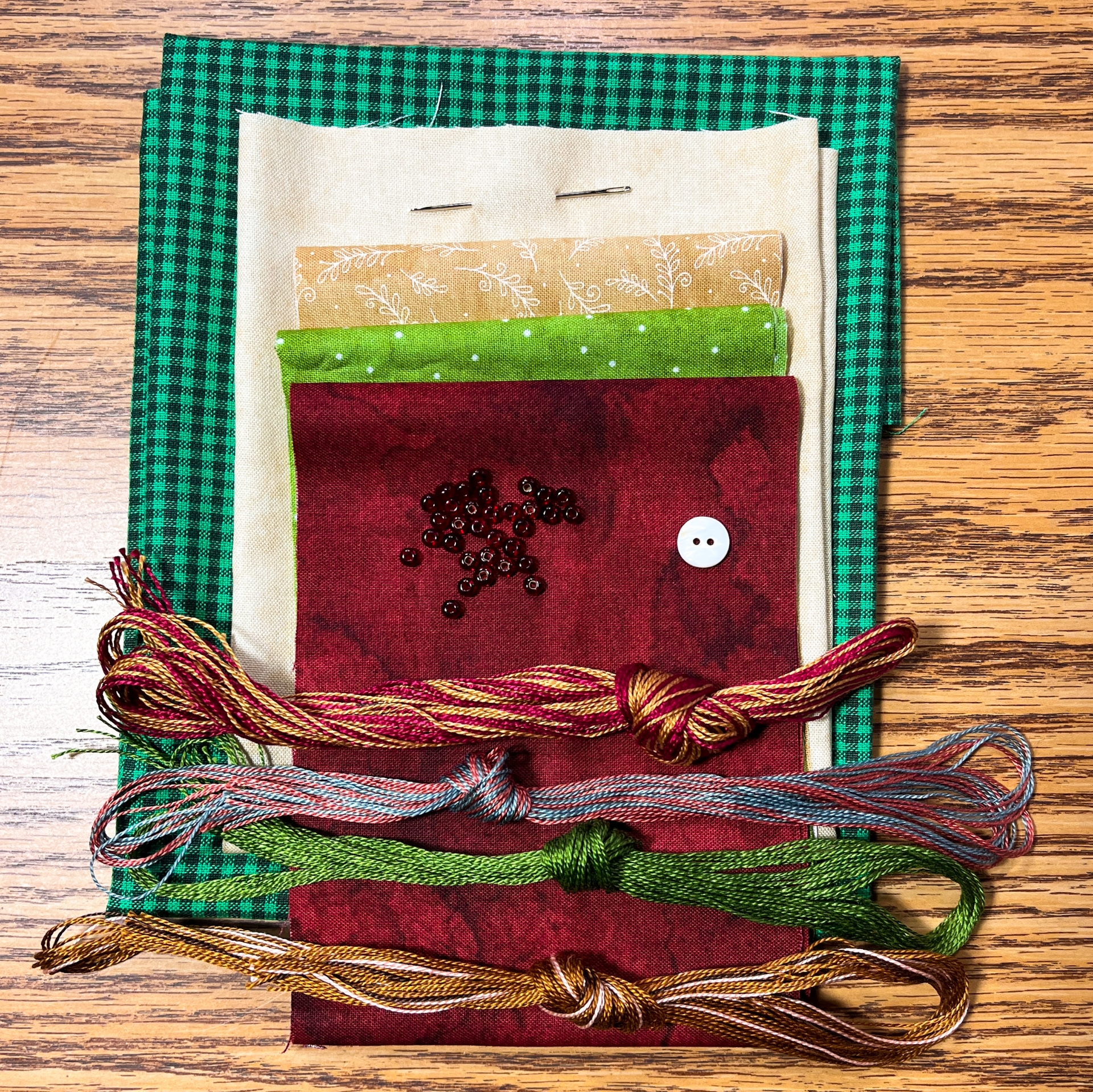 The Materials Pack includes the ALL the Fabric, Perle Cotton, Beads, Button and Needle!