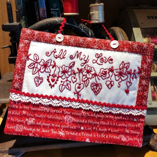 The Little Sentiments Words border along the bottom is filled with lovely verses to add to the romantic string of Hearts & Flowers in the embroidered center