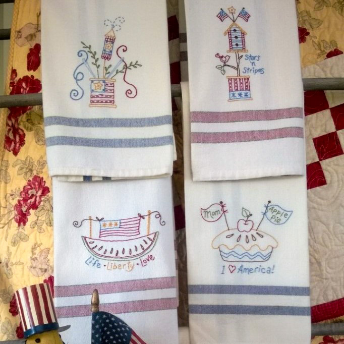 Celebrate some Americana FUN as you embroider tea towels for lots of partiotic holidays throughout the year. Designs are stitched on Red and Blue striped tea towels from Dunroven House. These don't take much time to embroider so you can have a set for your kitchen and make welcome gifts for friends and family!