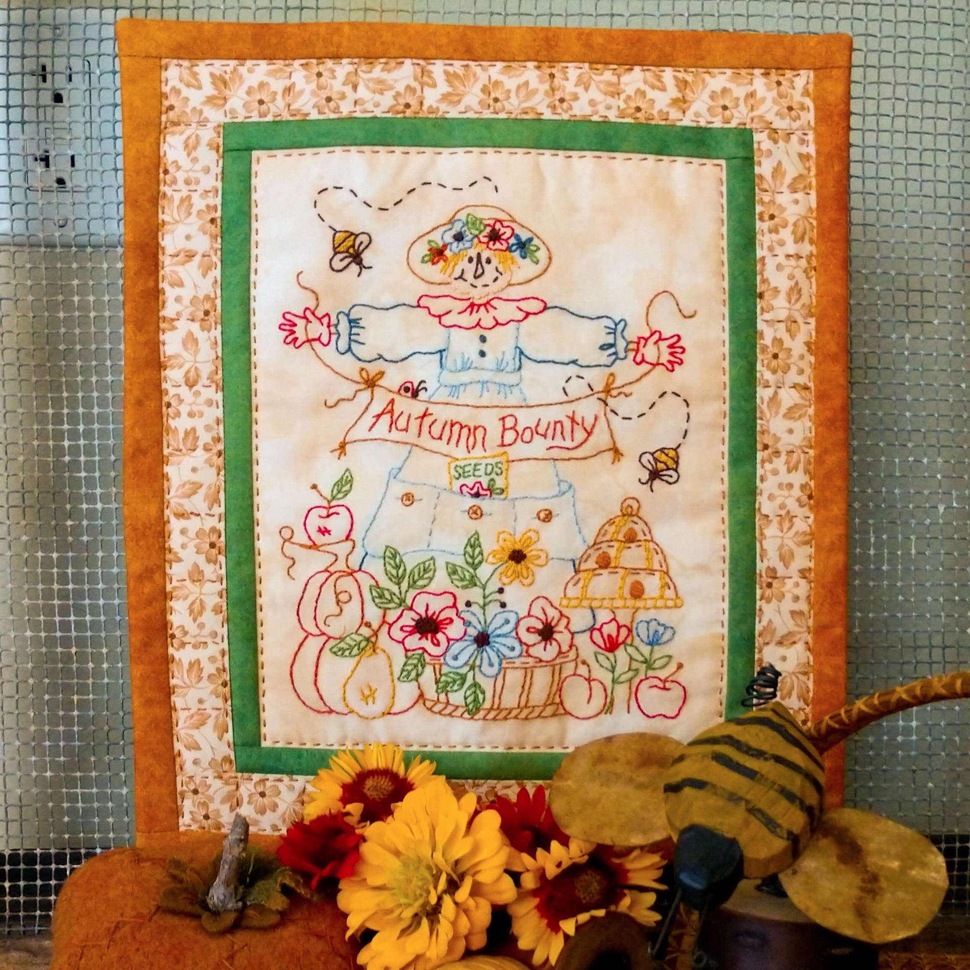 A Sweet “Lady Scarecrow” celebrates her Autumn Bounty with a collection of fruits and veggies embroidered in beautiful shades of Autumn! No crows here, just buzzing bees enjoying their cute hive set near a basket of flowers and fancy fruits and veggies. Show off your Autumn Scarecrow with flowers from you garden to enhance your embroidered flowers!