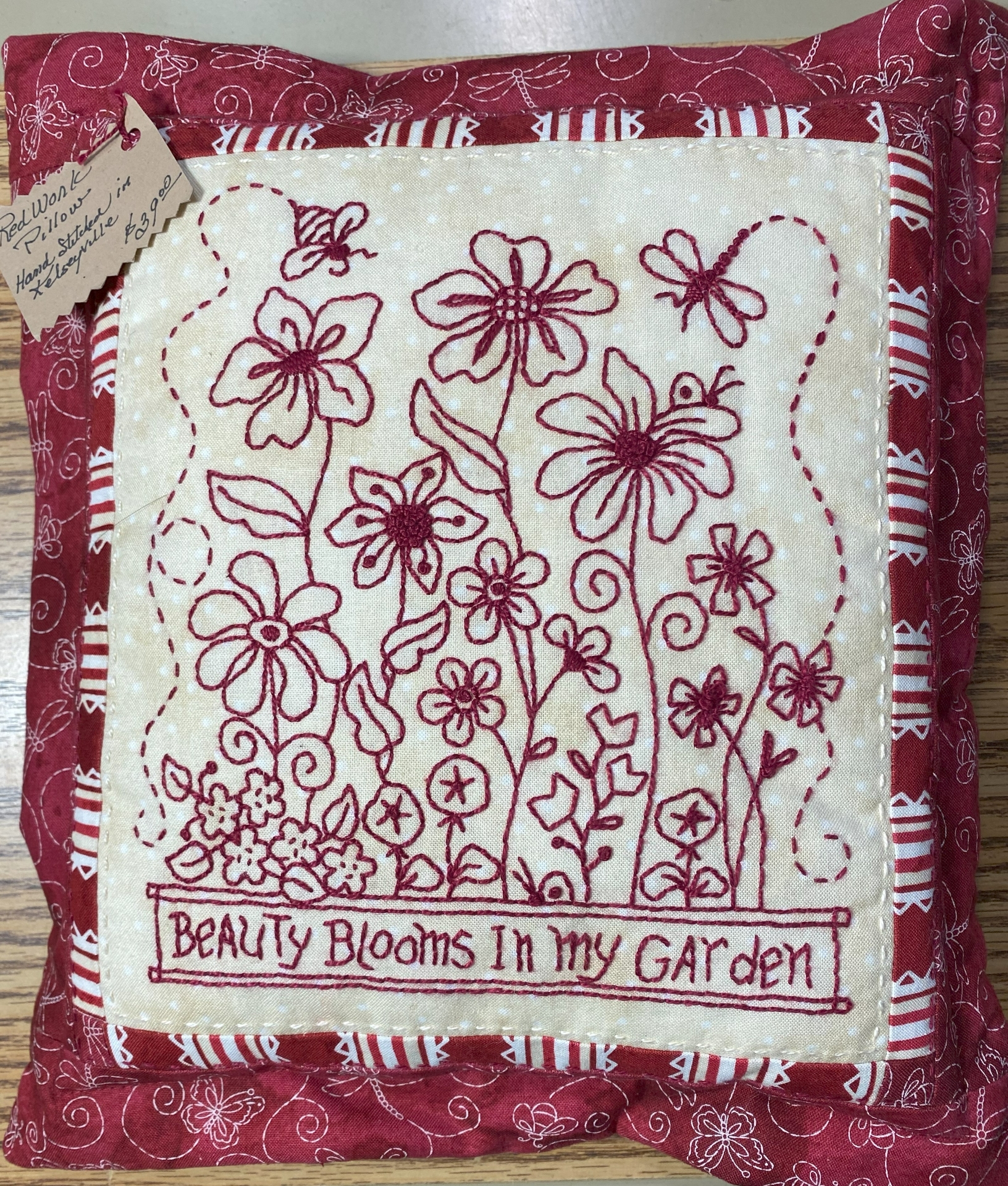 A Garden of Summer flowers all stitched on Polka-Dot fabric to add whimsy to the flavor of your RedWork pillow.