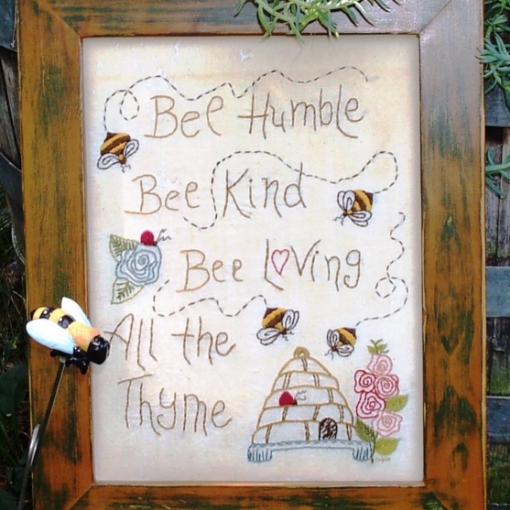 A primitive look at peaceful Summer! Bumble Bees buzz all around reminding us to “Bee Humble, Kind and Loving”……simple ideals to strive for and create a pleasant life for you and others. Muted embroidery floss colors stitched on tea-dyed muslin add to the primitive flavor of this Quick-to-Stitch design.