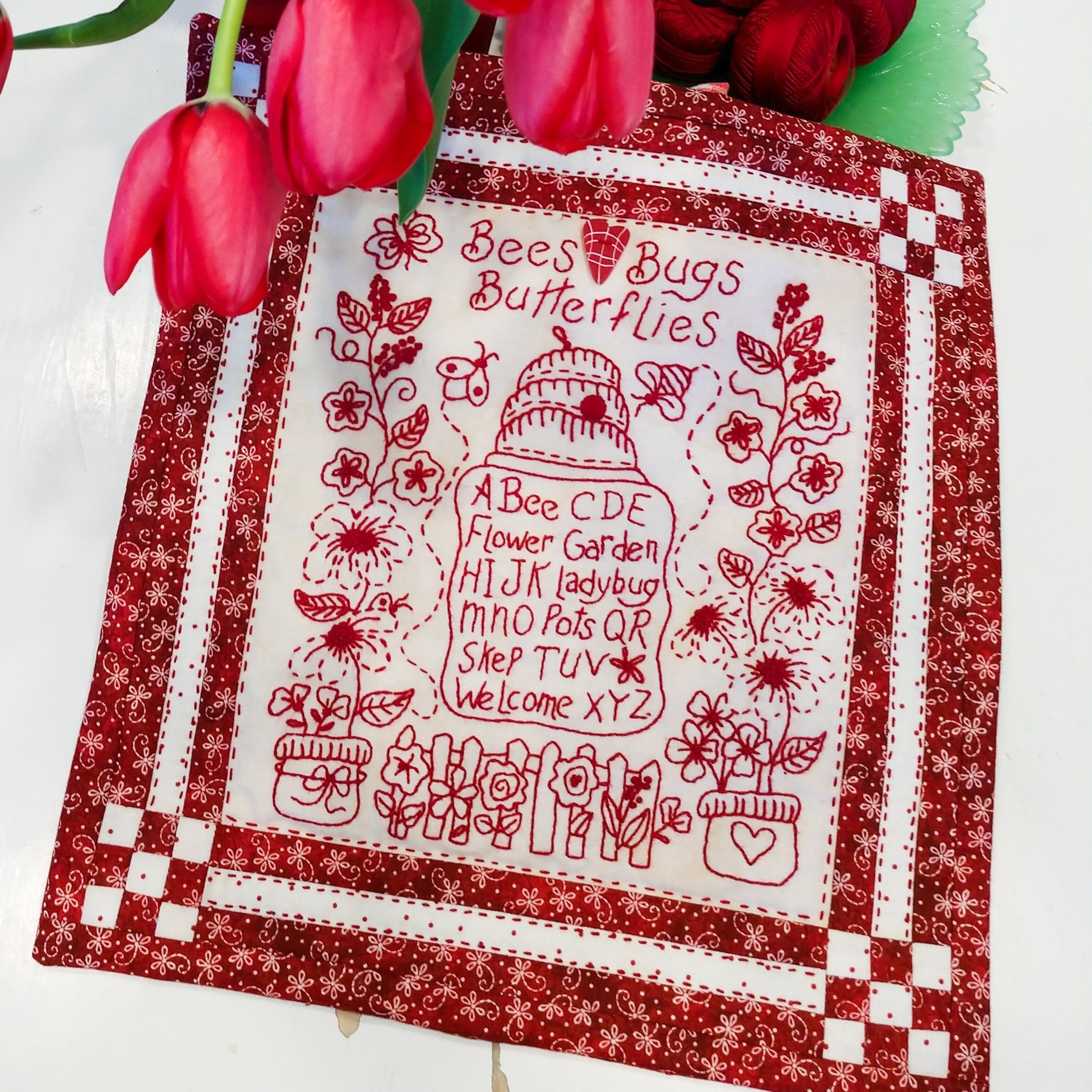 A “not so traditional” Sampler with an alphabet in the center topped with a Bee Skep. A garden of flowers along a picket fence and in flower pots with tall vines of blossoms. Embroider a Bee, Ladybug and Butterfly to fly around your RedWork Garden.