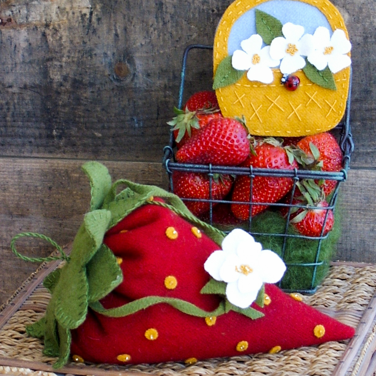 A HUGE Wool Applique strawberry pin cushion in 100% wool – a fun addition to your stitching accessories. Fill the blossom with emery and your strawberry with 2 pounds of crushed walnut shells or Sand! Collect your needles in the "basket" needle minder and sharpen them in the perky strawberry blossom emery.#8 Perle Cotton Used: 783 Gold and 937 Olive.Handy Hint: thread a crewel needle with each of the Perle cotton colors to speed your applique.