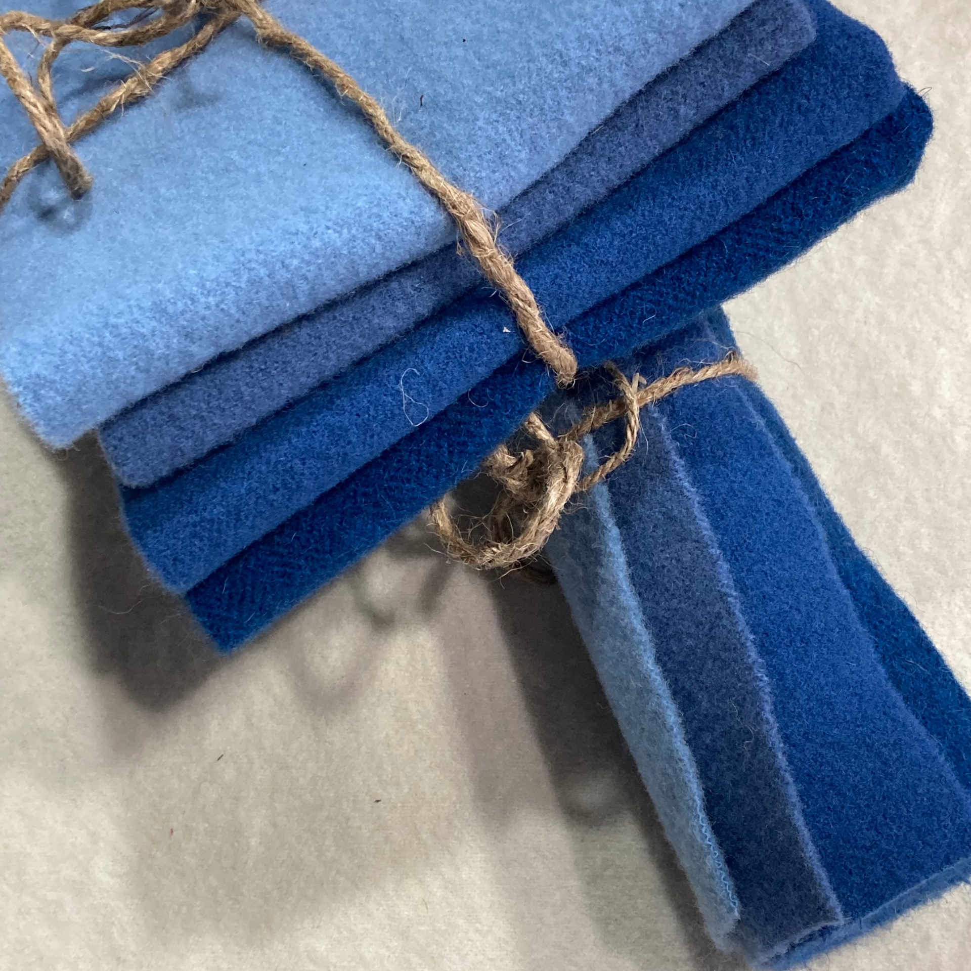 Each Fat Eighth has been pre-felted for you and is ready to use in any of your needlework projects. Handy small squares of shades of blue to use for all your wool projects.