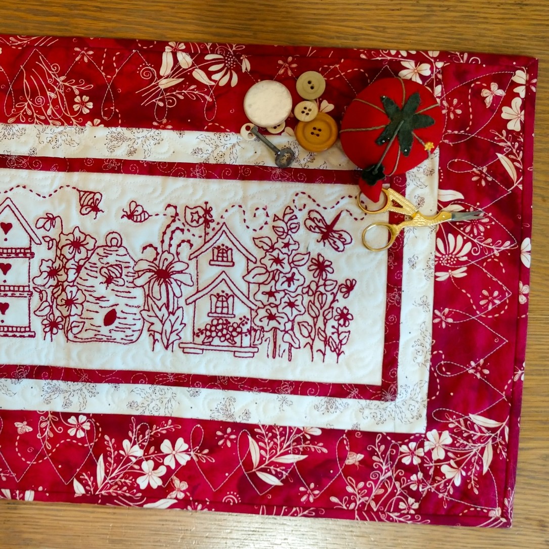 A charming RedWork Garden is filled with Flowers and Bird Houses to enjoy in your home ALL year long. The generously sized Bird House Garden Table Runner is framed with ‘In Stitches Collection’ Fabrics complete with whimsical Flying Things and lovely Wildflowers!