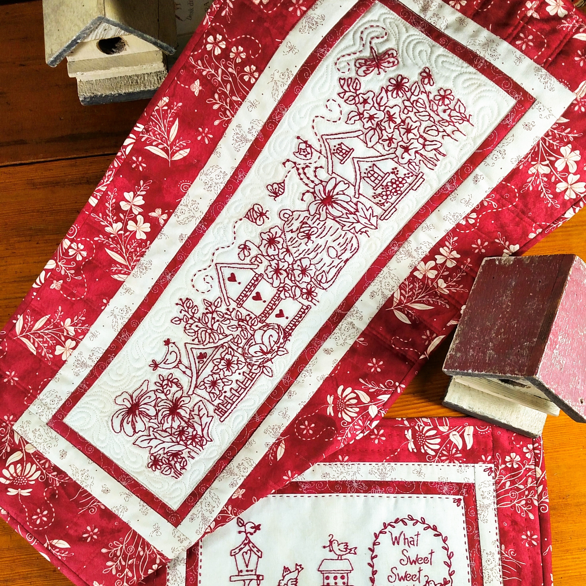 A charming RedWork Garden is filled with Flowers and Bird Houses to enjoy in your home ALL year long. The generously sized Bird House Garden Table Runner is framed with ‘In Stitches Collection’ Fabrics complete with whimsical Flying Things and lovely Wildflowers! The smaller RedWork Bird House collection and Verse makes a perfect Wall Hanging or clever Table Topper.
