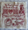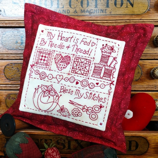 An Embroidered Top with a Sampler of Stitching motifs Is buttoned onto a cheerful Red Cotton Print Pillow With A variety of buttons.A Stitcher’s Pillow to make you happy!