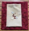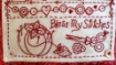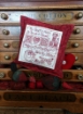 An Embroidered Top with a Sampler of Stitching motifs Is buttoned onto a cheerful Red Cotton Print Pillow With A variety of buttons.A Stitcher’s Pillow to make you happy!