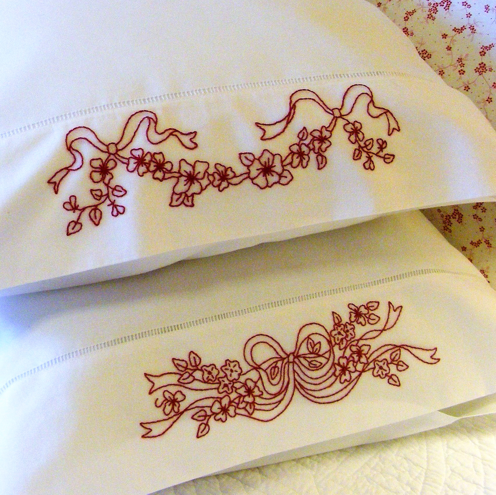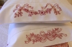 A delicate pair of RedWork designs to embroider on pillowcases for a romantic addition to your bed linens. Embroider on pillowcases you make using the enclosed instructions in your pattern.