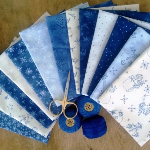 All 13 of the Blue Collection of Snow Happens Cotton Fabrics from Bird Brain Designs. Includes the White on Cream Snowflakes to use with ALL the Blues. Perfect for Winter and Christmas Embroidery and Quilting Projects you Create.