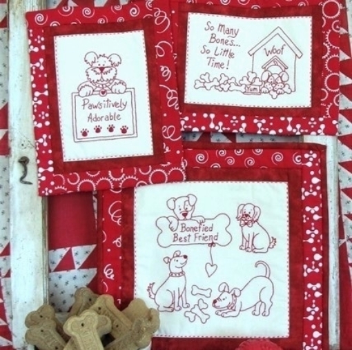 We LOVE our Dogs! Have some fun with 3 Doggie designs in RedWork sure to please any Dog Lover. Make wall hangings, pillows and cute signs to hang on the door knob.