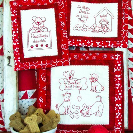 We LOVE our Dogs! Have some fun with 3 Doggie designs in RedWork sure to please any Dog Lover. Make wall hangings, pillows and cute signs to hang on the doorknob.