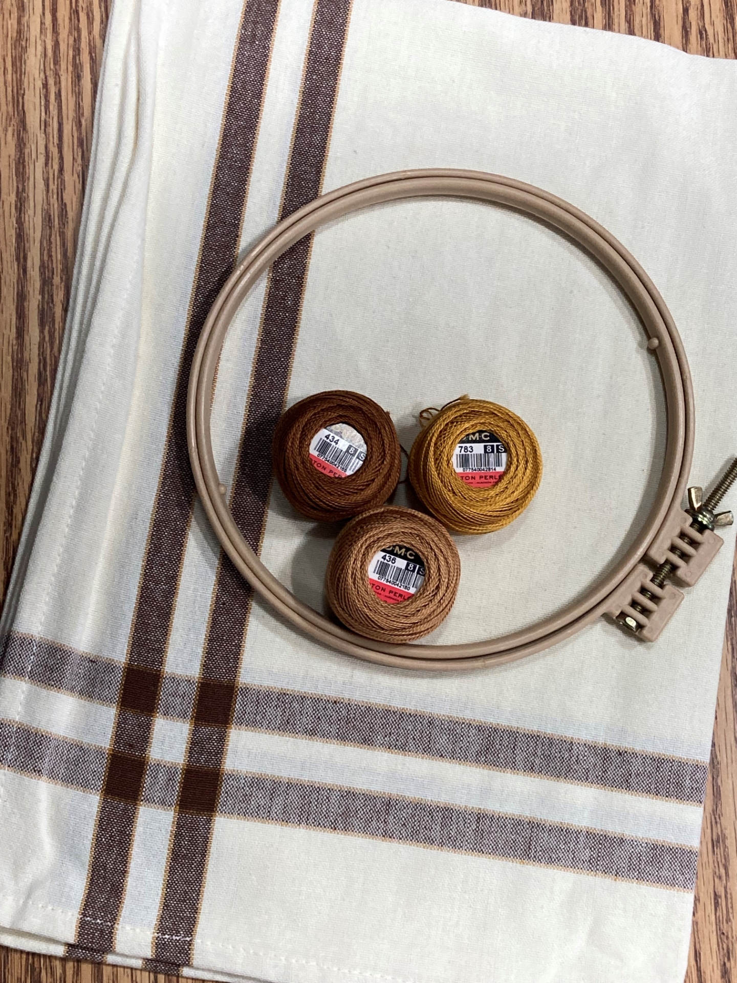 A terrific 100% cotton tea towel with a Brown Stripe bordered in Gold on a creamy natural background. Embroider your towel using one of our Tea Towel Patterns with colorful #8 Perle Cotton or a RedWork Design using a complementary color. Use your towel in your own kitchen or it will make a welcome gift!Trace your designs directly onto your machine washed and dried then ironed tea towel with a Frixion Pen.If you DO NOT like to TRACE, use Stick 'n Stitch. Print your designs on the Stick 'n Stitch with your printer. Pull the printed film off the paper backing and finger press onto your tea towel. Add your hoop and get stitching in just minutes - super stuff!A generous 20" x 28".