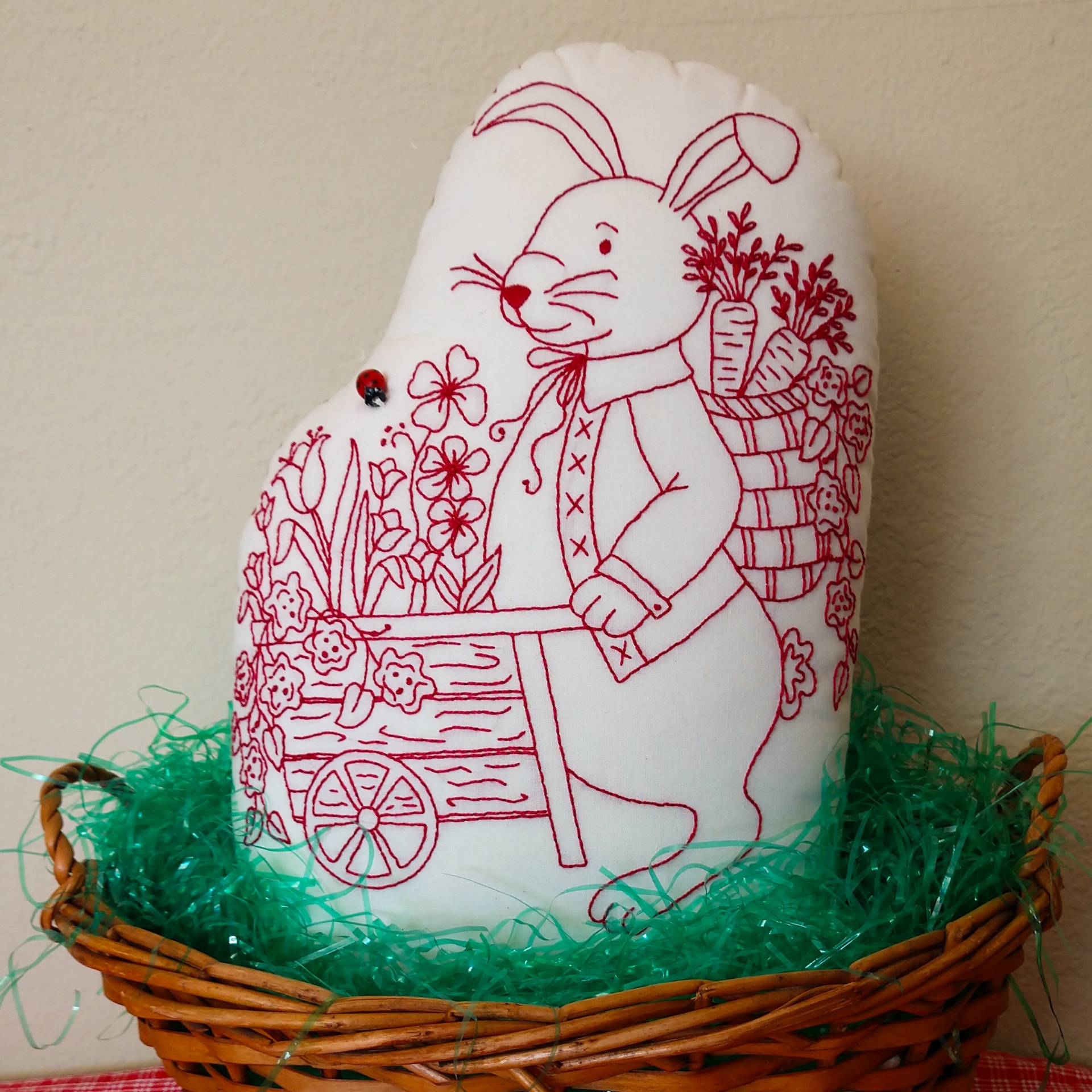 A Clever RedWork Bunny Doorstop Pushes His Cart Filled with Flowers for Spring and Easter. Let him Carefully hold your Door Open or let him join the Party Festivities and become the center of attention on your Table! Stitched In Cheerful RedWork Embroidery and Easily Finished. Fill with pillow filling and add a weight in the bottom (sand or crushed walnut shells) to keep Mr. Bunny standing tall. Of course Step-By-Step instructions included in your Pattern.