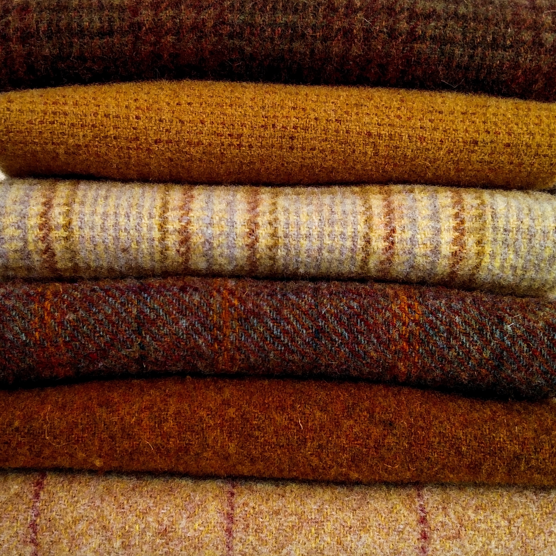 Six Golden shades for Wool Applique creating terrific designs for Summer and Autumn designs. Elegant textures and plaids will surely add "spice" to your STASH! Each of the Fat 1/8th pieces (13" x 16") has been pre-felted for you and are ready to use for applique as soon as the bundle arrives in your sewing room! ALL wool has been milled in the USA.