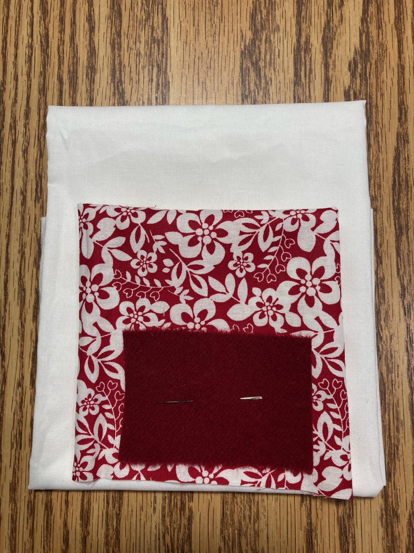 White muslin needed to honor your cat plus dark red wool for the mouse ears and the floral red and white fabric for the mouse.