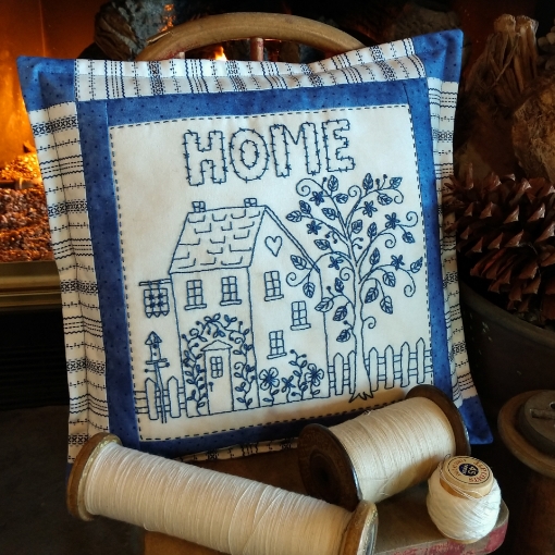 Home is where your Heart is! Celebrate your HOME with a BlueWork pillow…..you can choose to finish as a Table Mat or WallHanging, too. A simple cottage with a picket fence, bird house, flowering tree and flowers plus a cute little Quilt Block Banner over the door to welcome friends and family. The 2 fabric sashing borders frame your Embroidered Home so effectively and Quick-to-Stitch and finish your design. A charming House Pillow to tuck in a favorite spot in your home!
