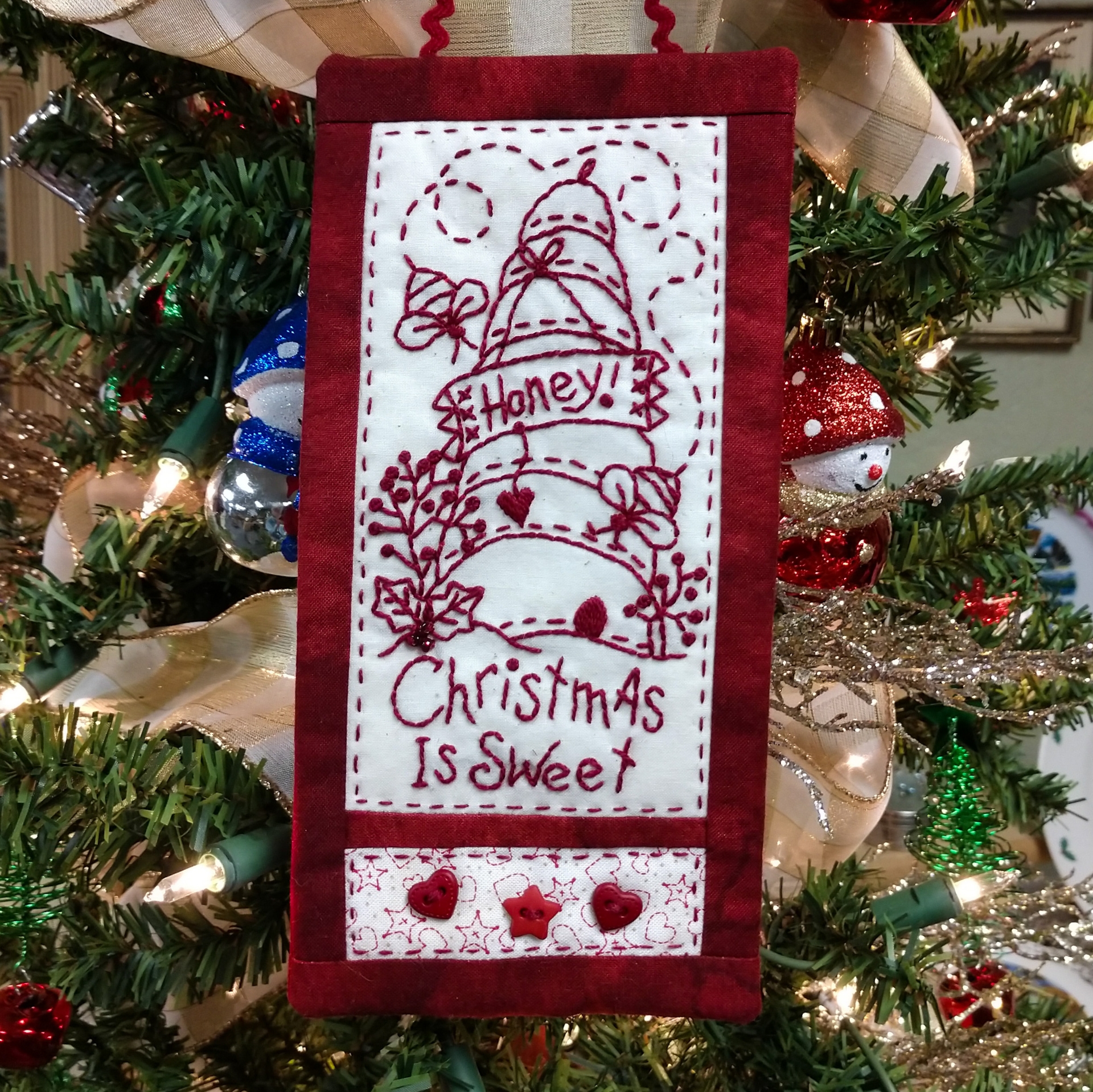 A Bright and Cheerful Holiday Ornament. A charming TALL Bee Hive with a “Honey!” sign hanging from one of the Hive’s segments. Buzzing Bees swirl around your Holiday Hive with Red Glass Bead Winter Berries and Holly around the Hive’s base.