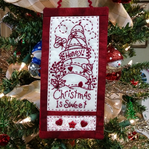 Add Red Heart and Star Buttons on the “matching” Heart and Star fabric along the bottom of your Ornament.
