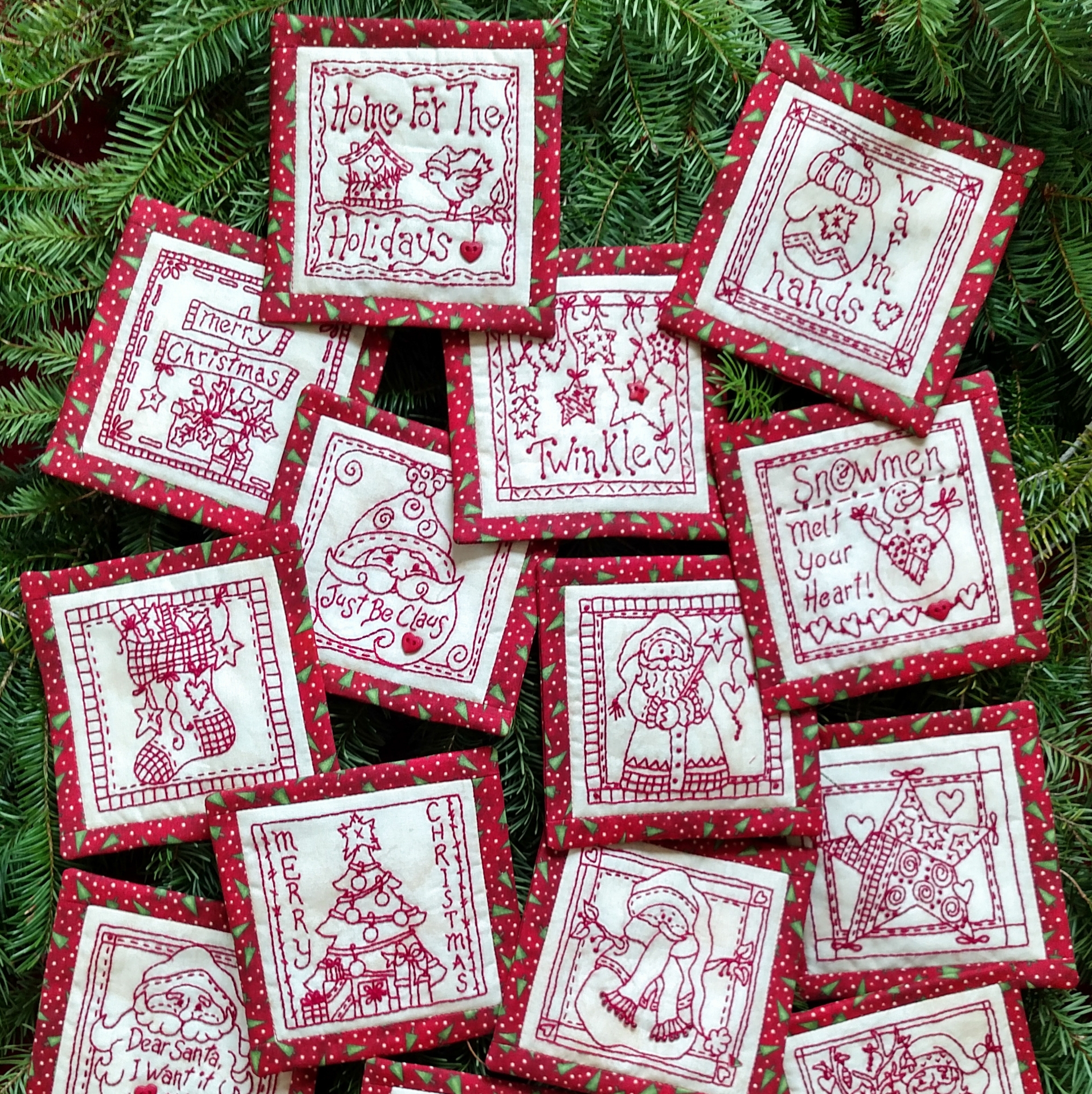 LOTS of RedWork ornaments to smother your Christmas tree! 16 Ornaments finished in a very Clean and Simple way so they look wonderful for your Holiday decorating. Each has Easy-To-Do embroidery stitches with plenty of Holiday designs plus borders adding even more interest. Spice up your ornaments with optional Red Heart and Red Star Buttons and shiny Glass Beads. I am sure you will think of many other uses for these cheerful Red and White Christmas Classics!