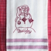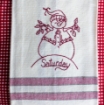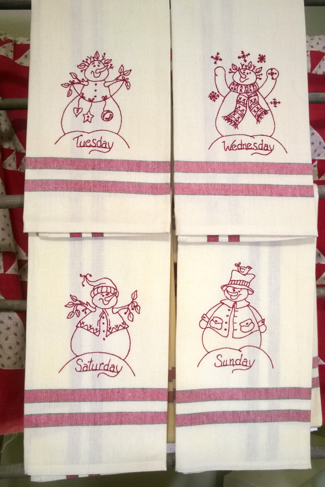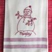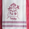 8 Snowmen Designs embroidered on Red Dunroven House Tea Towels for your kitchen or for a gift.