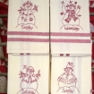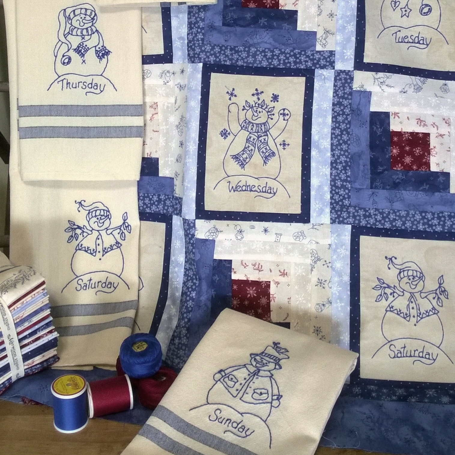 8 Snowmen Designs to embroider on Blue Tea Towels for your kitchen OR make them into a fun Winter Quilt to decorate your home....very cheerful quilt for dreary days! The Snowmen look great in bright Robin Red too on a Red Striped Towel.