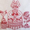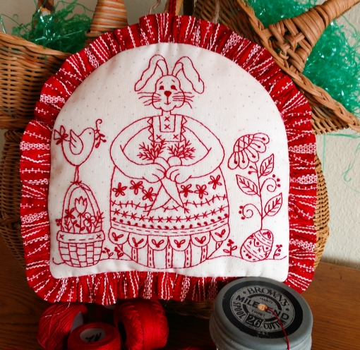 A nice round “egg-shaped” Bunny ready to help you decorate for Easter and coming Spring. The roly-poly Egg shape is decorated with your Embroidery Stitches like the decorated Egg sprouting a tall Spring Posy. Finish your Easter-Egg Bunny with a striped red and cream ruffle. The finished edge is simple but adds SO much interest to your Spring Holiday RedWork!