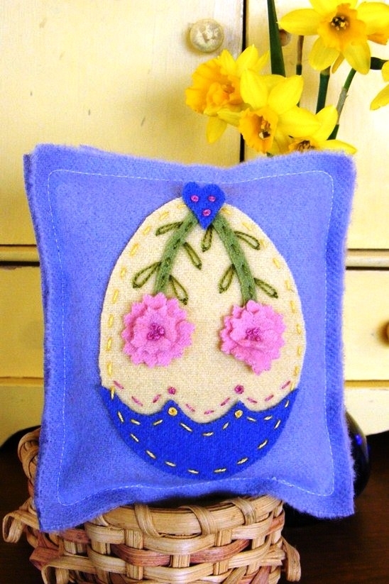 Make an Easter Egg Pin Cushion filled with sweet lavender buds. The lavender wool pin cushion is a super color foil for the lemon yellow egg decorated with a periwinkle scalloped bottom border. The fluffy rose colored flowers add a beautiful accent at the end of the olive stems. Simple embroidery stitches are used to applique this petite and pretty pin cushion that you can also use as a sweet sachet.