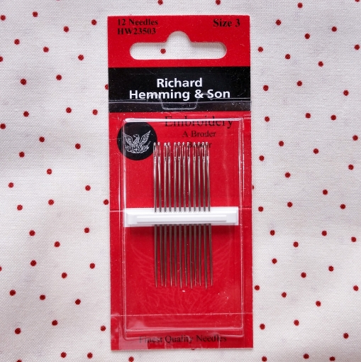Richard Hemming needles, Made in England. Available in size 3 or 4. Handy Hint: thread a crewel needle for each of the Perle Cotton colors in your design palette to speed your embroidery or applique.