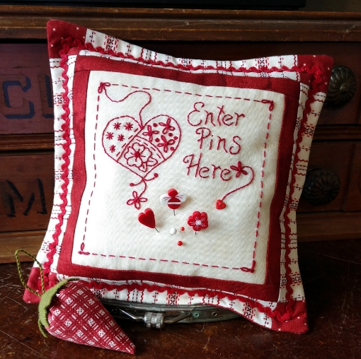 Make your own Easy-to-Stitch Pin Cushion with pieced Red & Cream cottons you embellish with different embroidery stitches adding more design interest and stitching FUN. Add a tiny Red Heart Button at the end of your arrow!