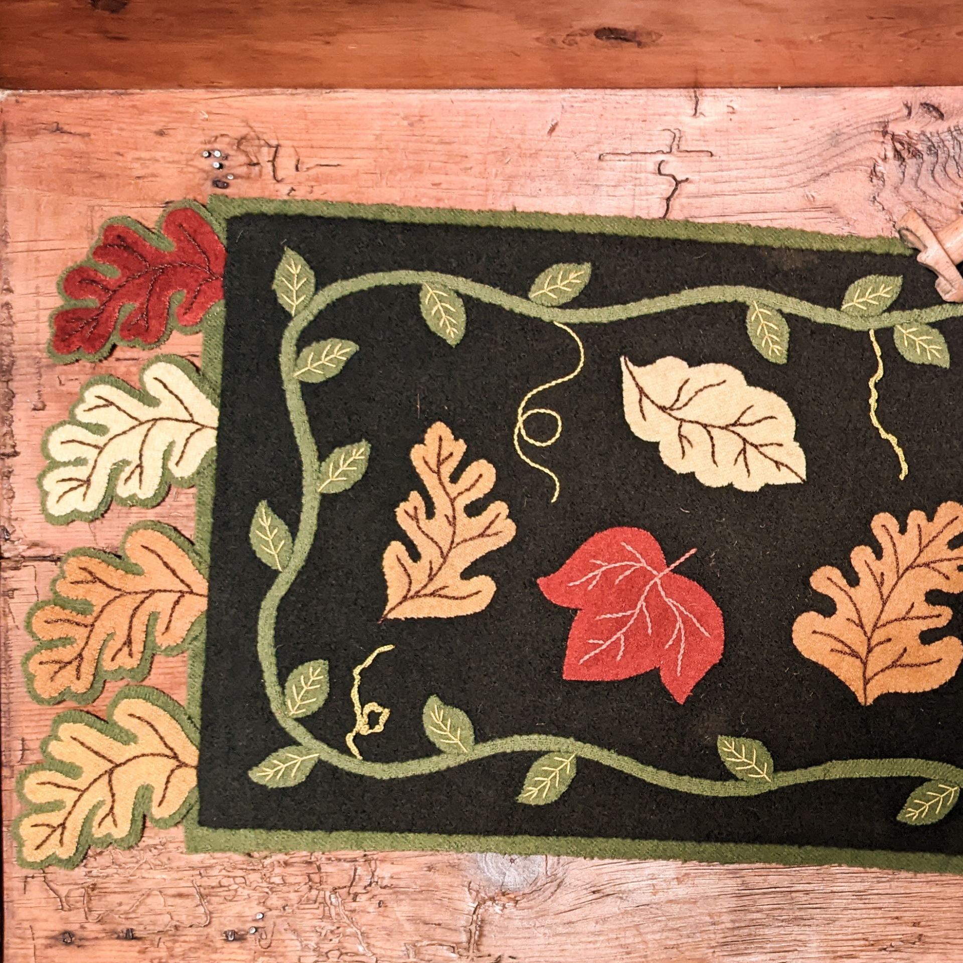 A Lovely Wool Applique Table Runner to Celebrate the Colorful Autumn Season from Halloween to Thanksgiving. 100% Pre-Felted Wools Create all the Beautiful Leaves with Wonderful Depth of Color and Texture. The Clever Leaf Ends are a Special Way to Finish your Table Runner. Enjoy searching out your own cache of beautiful wools to create your table runner!DMC #8 Perle Cotton Colors Used: