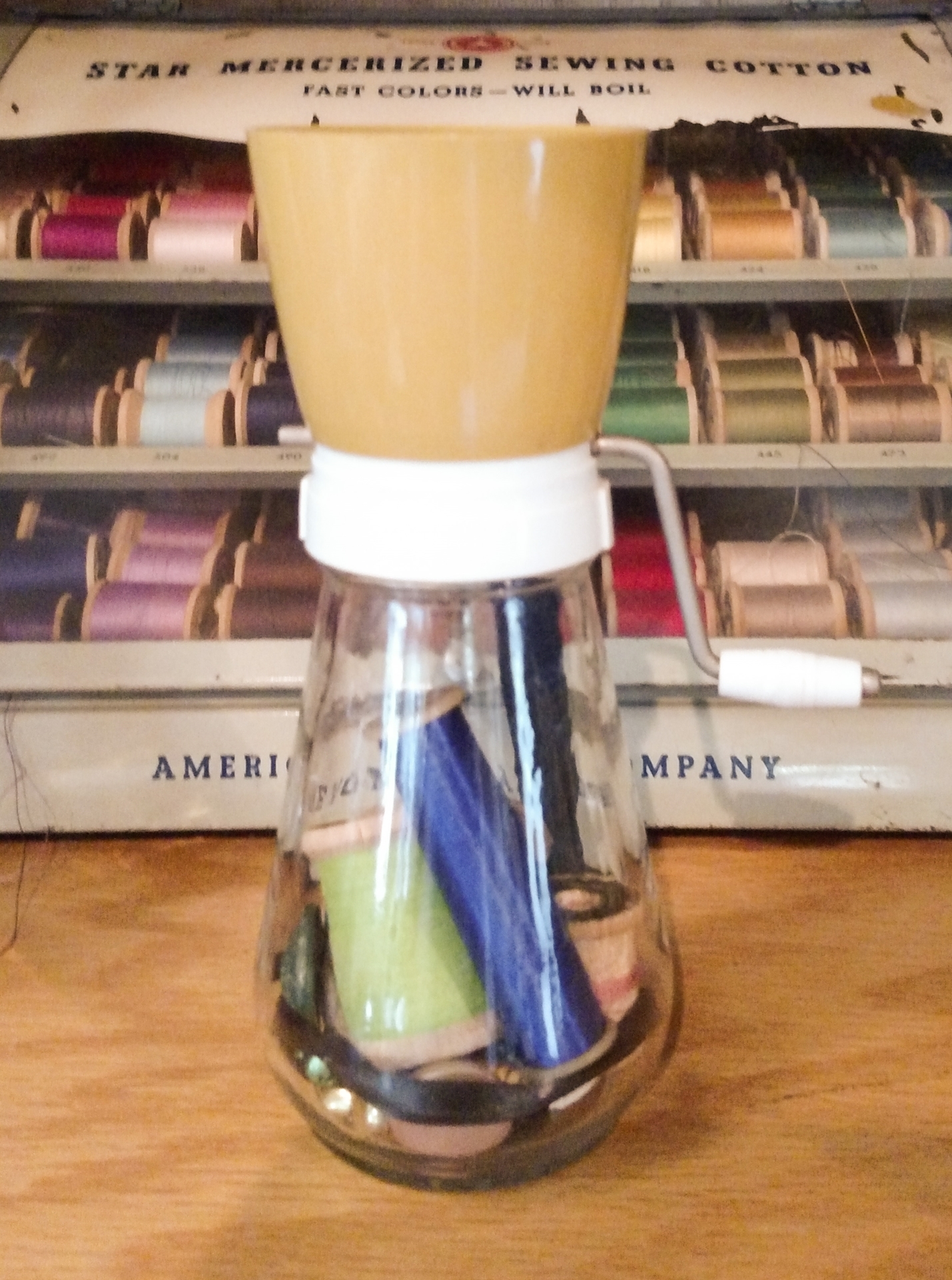 Tall Nut Grinder with a retro flavor. This grinder has a gold plastic top to hold the nuts as you grind them up.....a very mid-century color! Filled with goodies to come to your Sewing Room....how fun on a shelf with other collectibles!