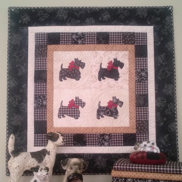 Beautiful Black and Tan "A Quilter's Garden" fabrics designed by Bird Brain Designs plus a Splash of Red from the collection will make your FREE Katie Quilt Pattern Wall Hanging perfect to honor a Scottie Dog and your dog too!