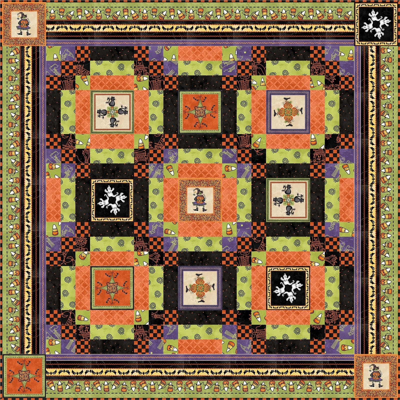 Make the 54 1/2" square quilt featuring the 5 amazing Halloweenie motifs Blocks from the printed Kaleidoscope panel. The other fabrics in the quilt are from the Halloweenie Cotton Collection. A Perfect quilt decoration to greet one and all during the scary Halloween Season!!