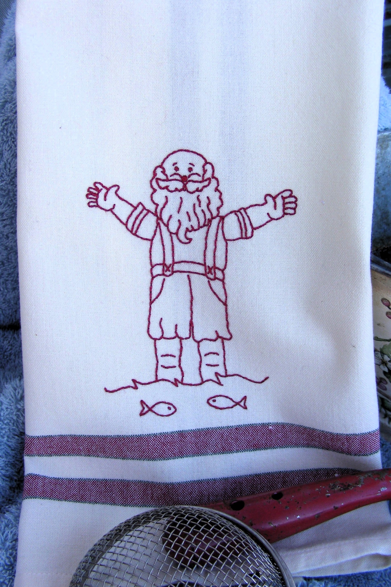 Make a Summer RedWork Tea Towel with Santa on vacation. This is what Santa does in the summer - take a dip in the lake or ocean! Enjoy your holiday time and stitch up a NEW design in just an afternoon or evening.
