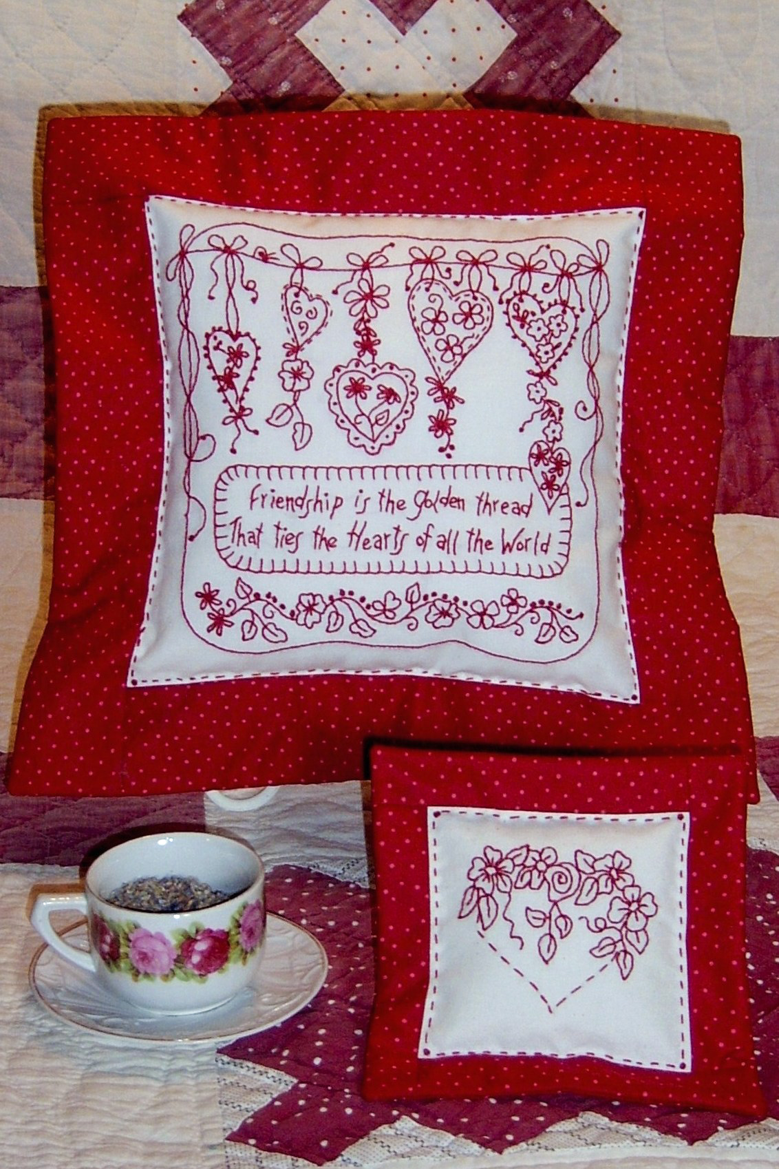 A pretty RedWork embroidery pillow with a string of flowery hearts plus a friendly saying "patch". Make one for yourself or for someone special to you. Include the little heart filled with lavender buds to create a fragrant memento for your friend.The sentiment on the pillow is: "Friendship is the golden thread that ties the Hearts of all the World"Trace your design directly onto muslin with a handy, heat erasable Red Frixion Pen