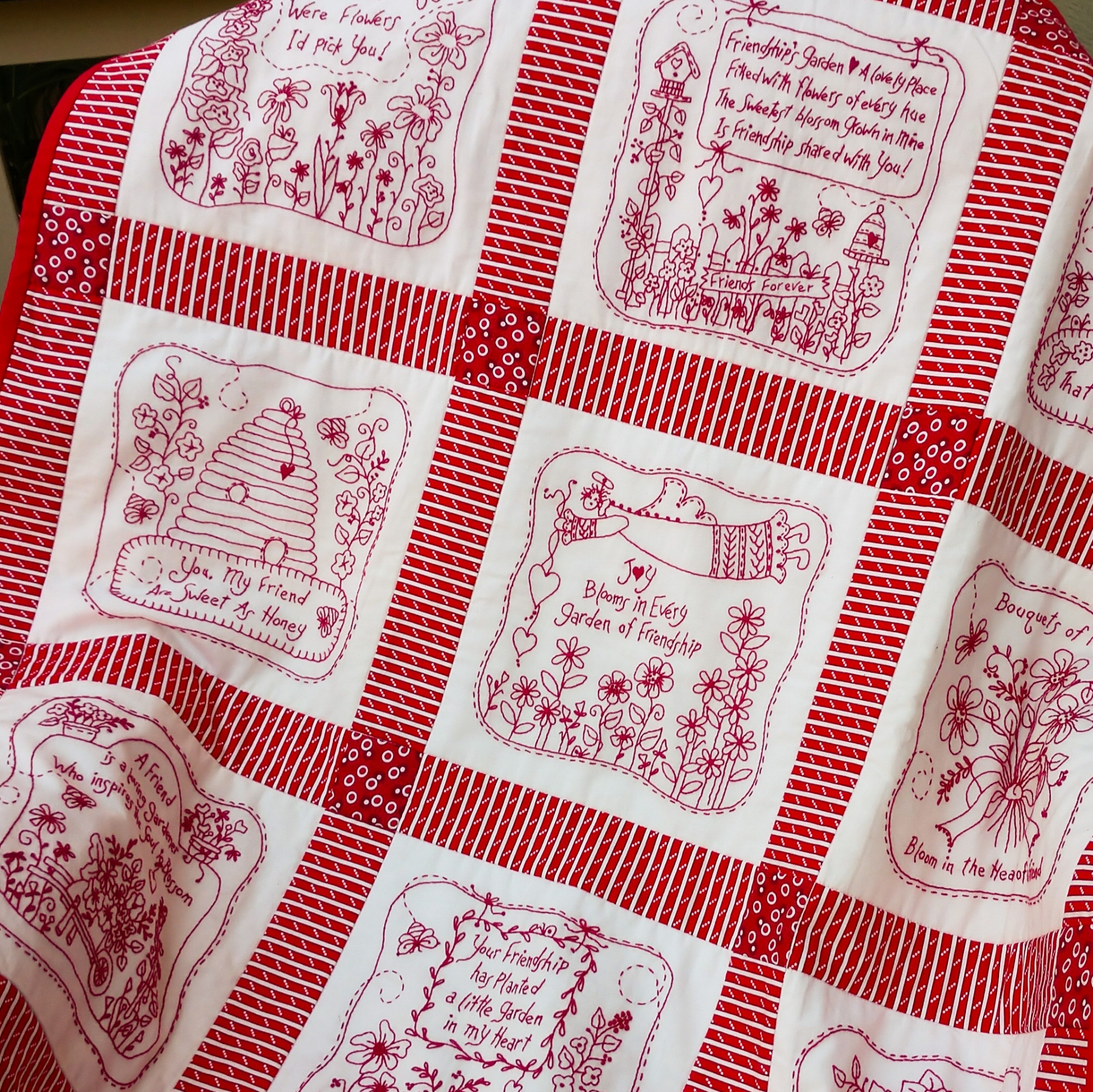 Celebrate Friendship with 9 Sweet Designs that have "Friendly" Sayings and Pretty Gardens Blooming with Flowers. Make your Quilt in Crisp Red and White RedWork or Embroider in Colorful #8 Perle Cotton for a Really Special Quilt. Quilts are finished with the charming 1930's reproduction cotton fabrics.9 blocks will make a great BOM quilt project for your RedWork or Embroidery Club. Enjoy the special little quilt label included for you to personalize your Best Friend's gift quilt!