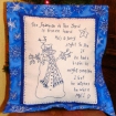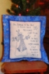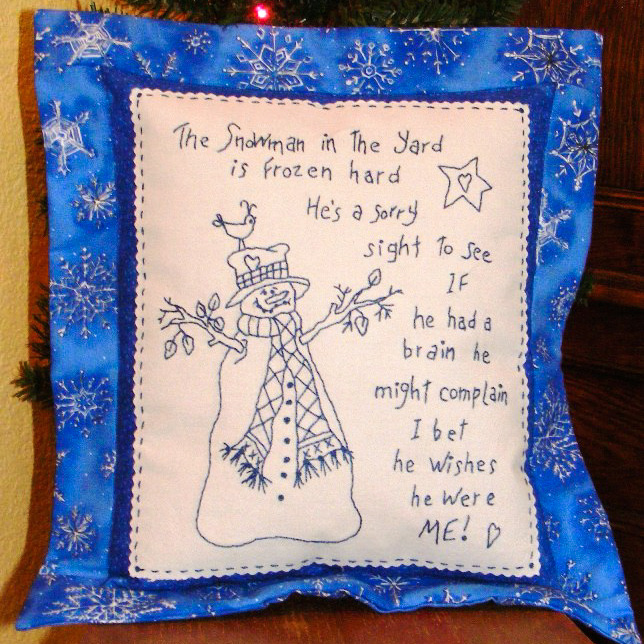 Pillow or wall hanging as shown - 12 1/2" x 14""The Snowman in the yard is frozen hard.He's a sorry sight to see.If he had a brain, he might complain.I bet he wishes he were me!"