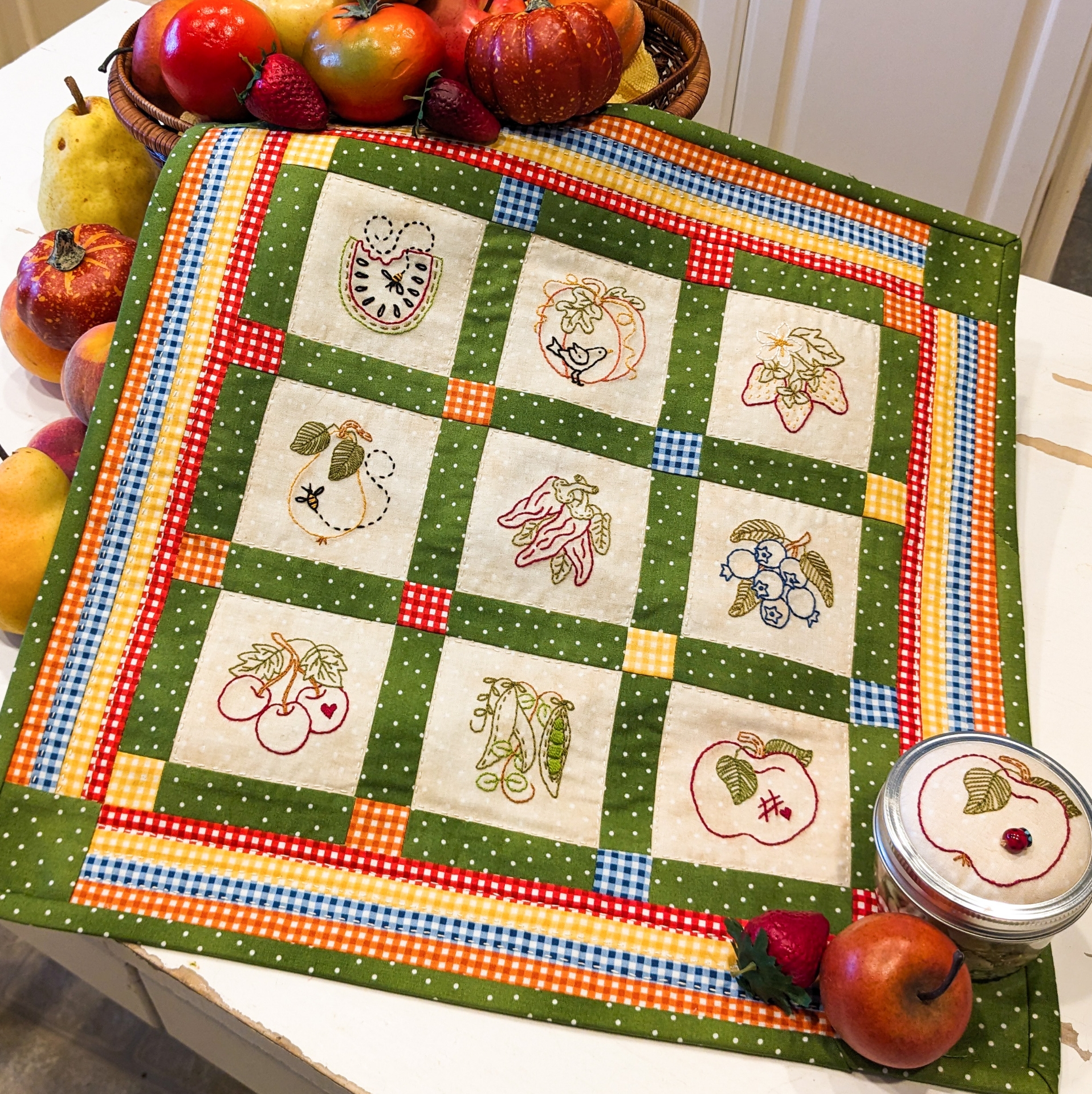 Petite Blocks embroidered with yummy Fruits and Veggies create a bright Mini Harvest Quilt. Enjoy your Quilt from Spring as we dream of planting a garden right through Summer and into Autumn to enjoy a happy Mini Garden Bounty!