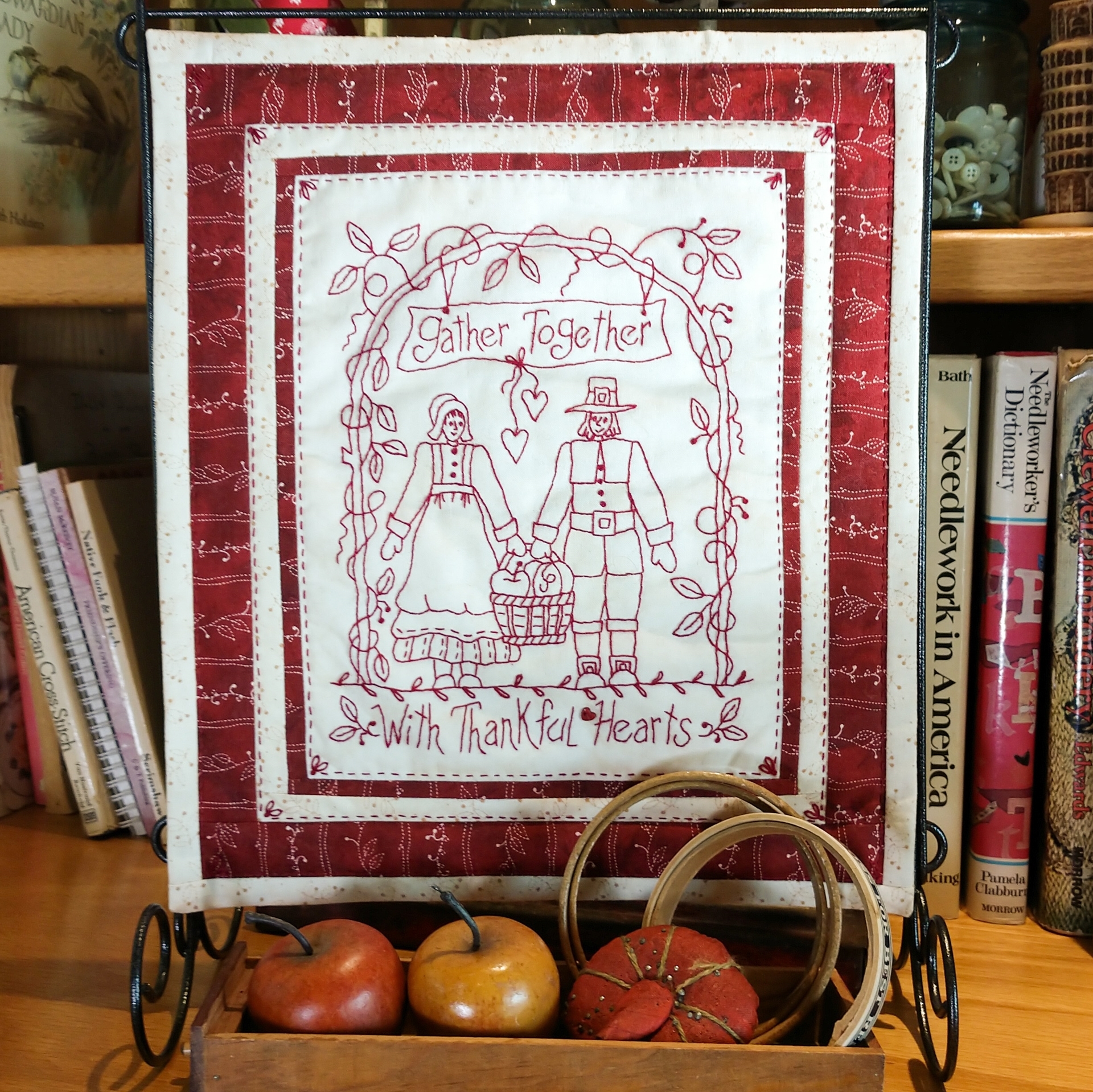 An ‘old world’ Pilgrim couple celebrate their bountiful harvest with a basket of fruit to share. The simplicity of the Thanksgiving scene under an arbor of vines, leaves and berries frame the couple so nicely. Add the verse plus Embroidered Hearts and a tiny Red Heart Button and create a welcome RedWork to add to your Thanksgiving Home Décor!