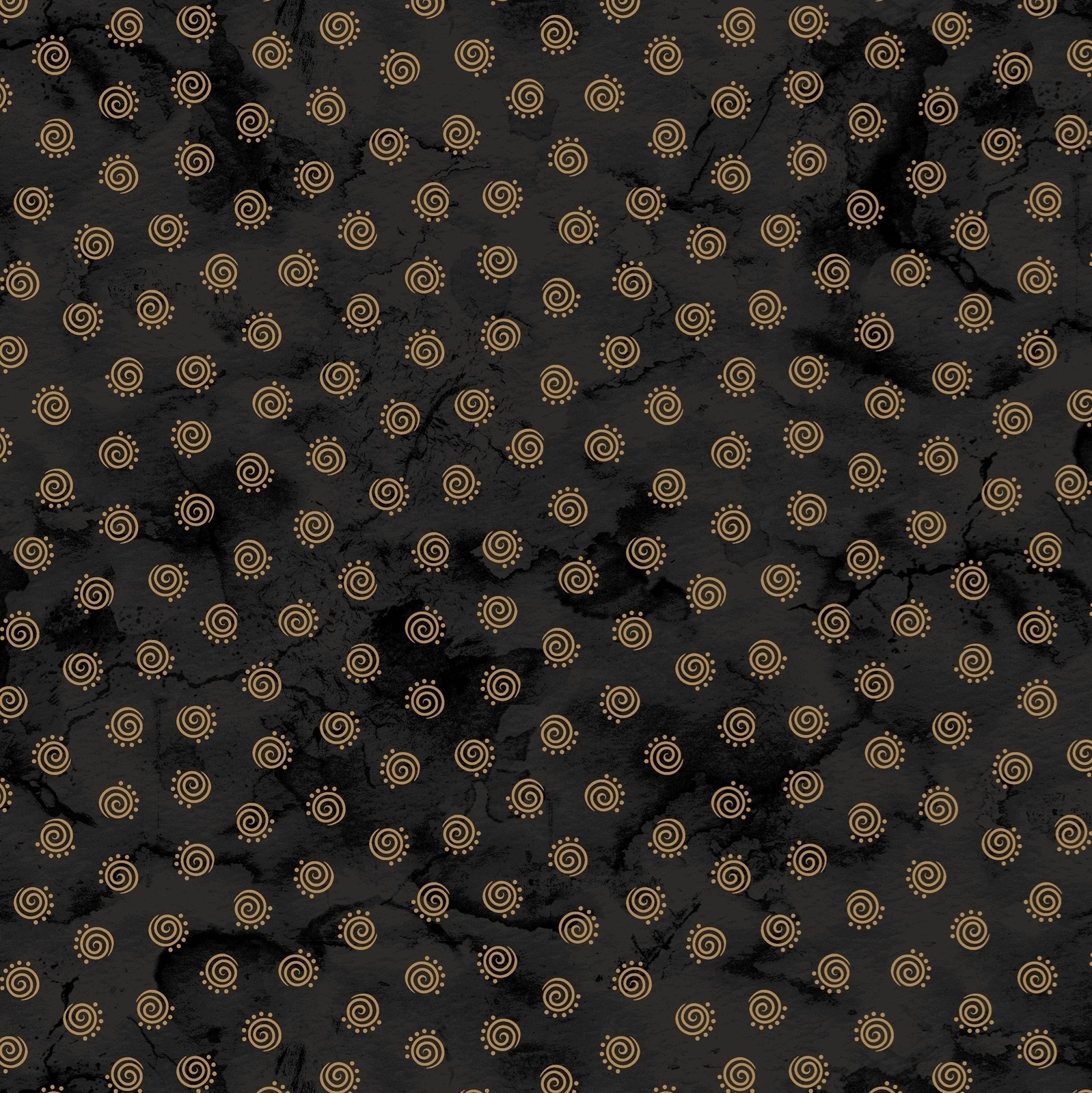 Small-scale Swirls plus "French Knot" dots along the curve in a geometric pattern printed on a tonal Black background. Great small, geometric print for piecing Embroidery and Quilting designs.