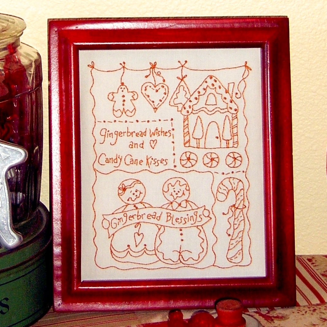 Sweet goodies for the Gingerbread lover! Make a sampler to frame or add fabric for a wall hanging or pillow. A cute sign hanging from a wooden spoon will add to kitchen decorating. The little Gingerbread boys on the sign make fun pins too!Framed Sampler 8" x 10"