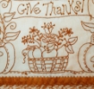 Shades of Harvest Gold create a warm and inviting Embroidery to celebrate the Seasons’ late Harvest and then Thanksgiving in your home. Savor Mother Nature’s gifts filling the basket that is flanked by a pair of whimsical Pumpkins sprouting tall Sunflowers. The decorative Feather Stitching around the outer borders adds wonderful texture and interest (and fun to stitch) to the Golden Glow of your Thanksgiving design.