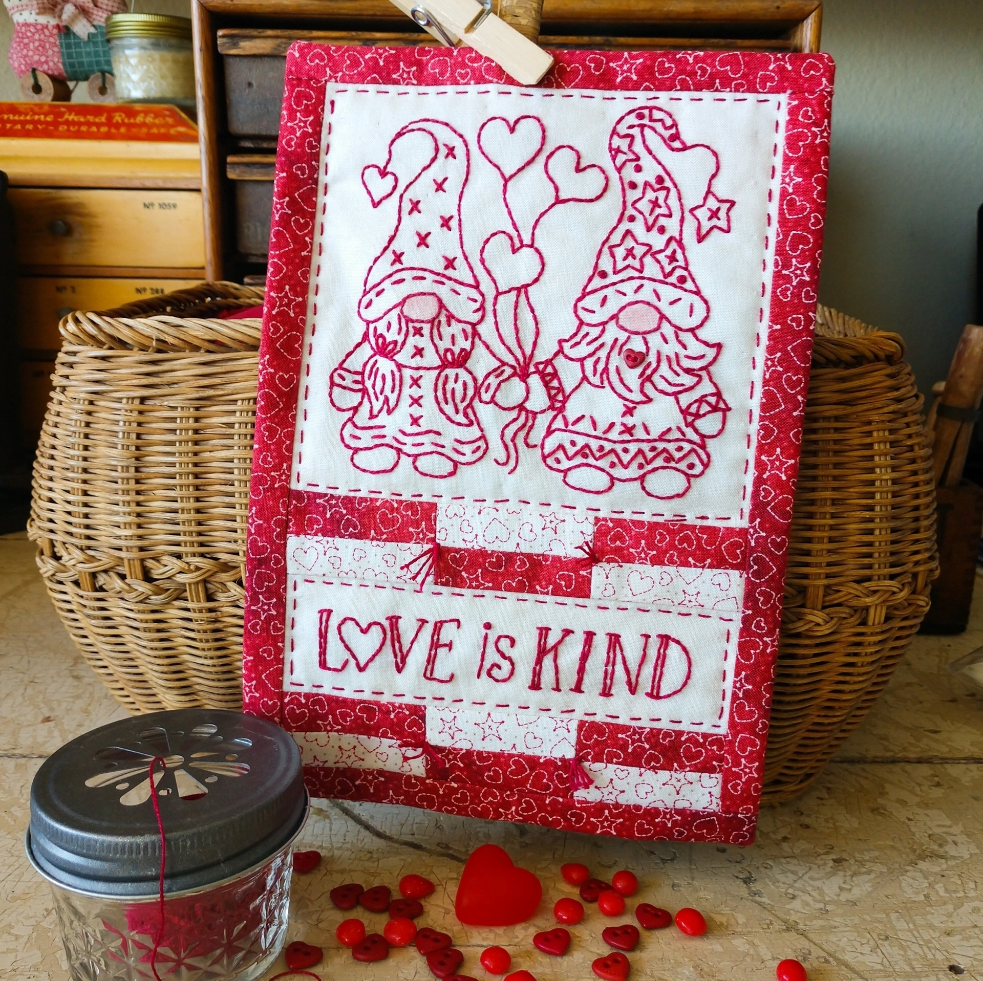 A Quick-to-Stitch pair of cute Gnomes posing with Heart shaped balloons will make you smile! Add a little blush make-up for pink noses and then a tiny Red Heart Button in Mr.’s beard.