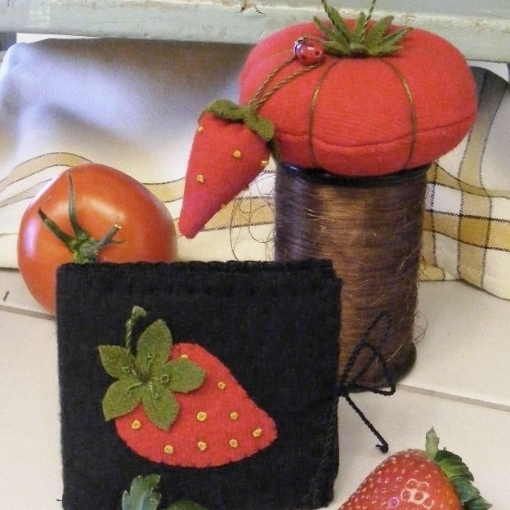 Our Materials Kit Packet includes the felted wool for all pieces, crewel embroidery needle, 3" needle and #8 Perle Cotton PLUS emery for your Strawberry - quick and easy to get stitching right away.