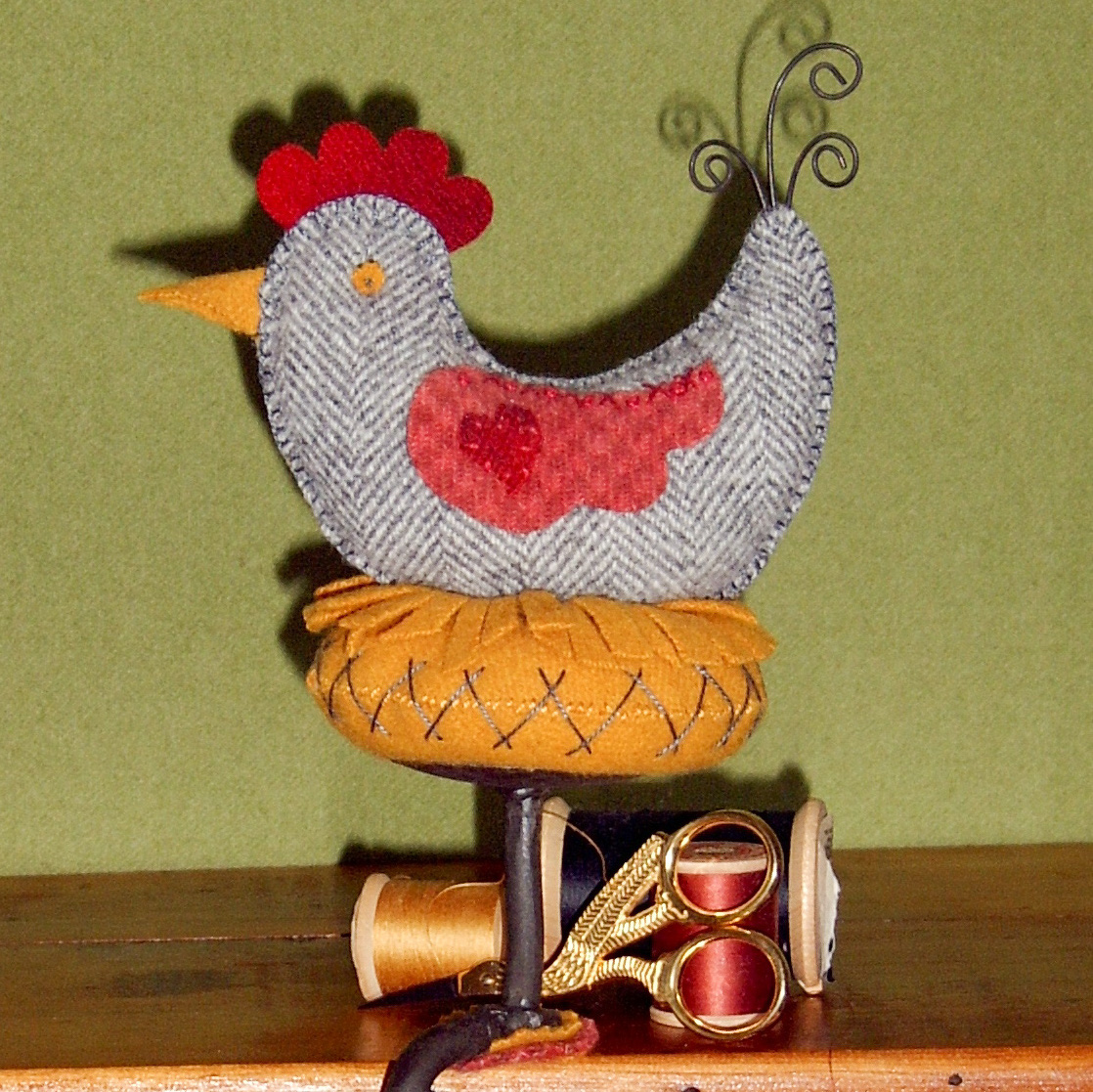This little Gray Speckled Hen makes a great folk-art Wool Applique pin cushion for your home and sewing room. Decorate the edge of the woolen nest with Herringbone stitches. Attach your hen and nest to the vintage-style metal clamp and let her keep all your pins in one place!DMC #8 Perle Cotton: 413 Gray, 783 Gold.Presencia #8 Perle Cotton: 1915 Robin Red